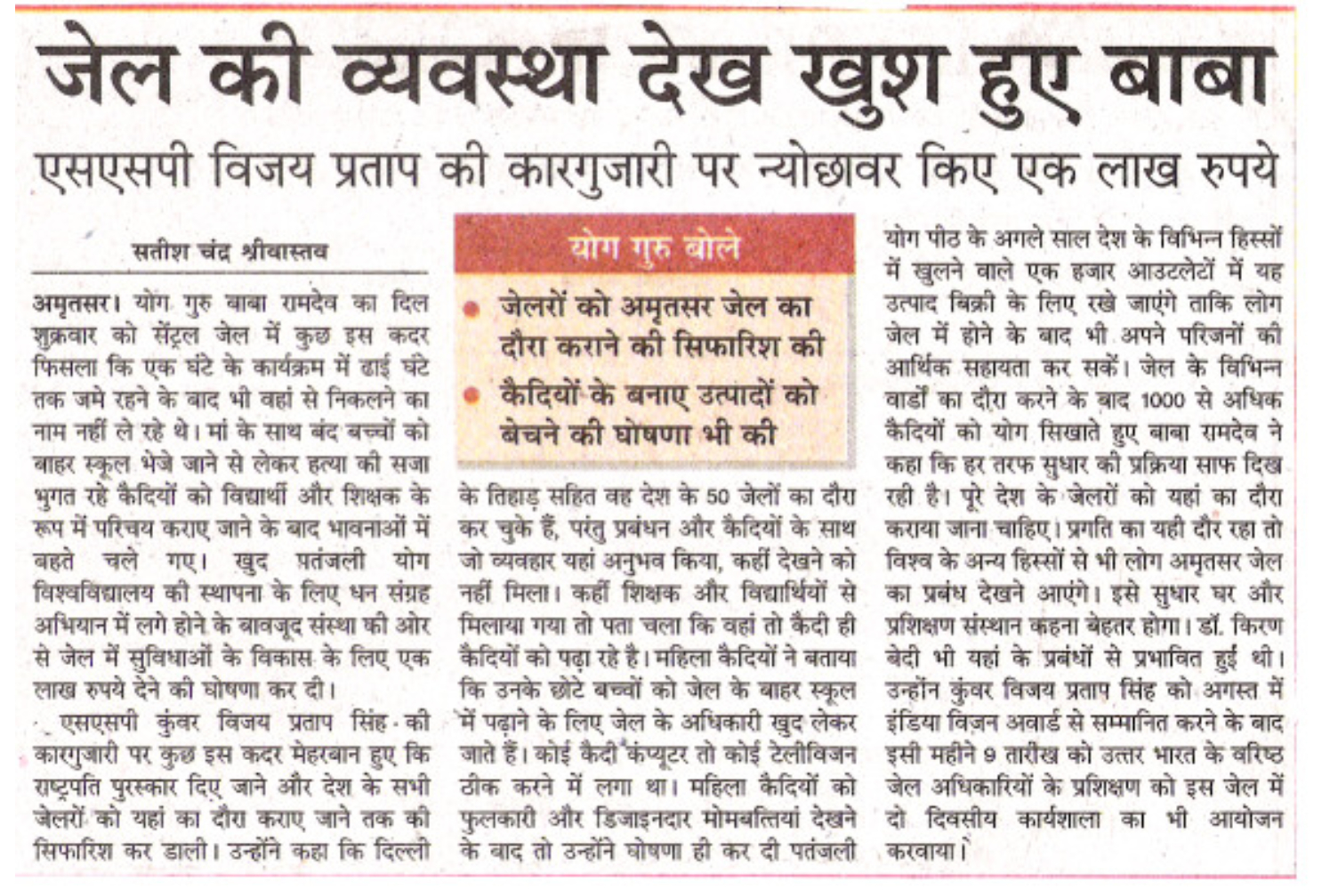 Swami Ramdevji visited Amritsar Prison on November 17, 2006. He was extended warm welcome by Kunwar Vijay Pratap Singh and other officers, prisoners and members from the community. Swamiji first took a round of the Prison area and then interacted with the prisoners. He was overwhelmed to see the respect of human values and dignity of mankind in this Prison. He was impressed with the education system being launched in the Prison with the help of educated prisoners. He also appreciated the functioning of Legal Aid Cell managed by the prisoners which has contributed in releasing more than 500 poor prisoners